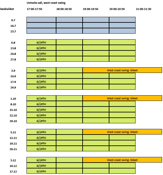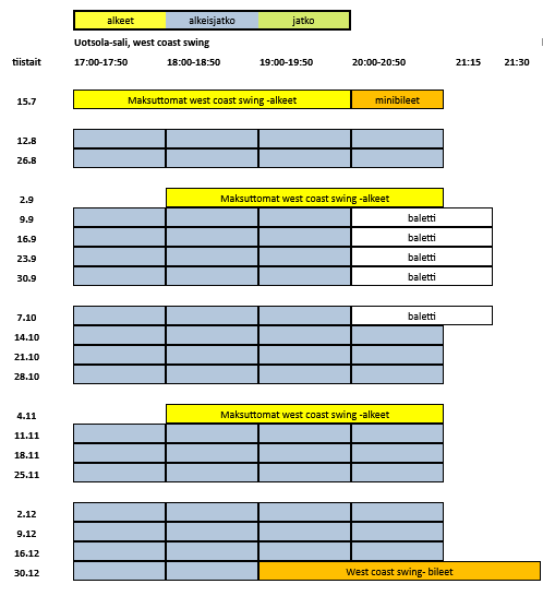 Uudet harrastajat huomio: Et tarvitse tunneille omaa paria. Ennakkoilmoittautumista ei ole, joten paritasapainokin voi olla mitä vain. Käytössä on parinvaihto, joka takaa sen, että kaikki pääsevät vuorollaan tanssimaan. Oman parin kanssa saa halutessaan tanssia.