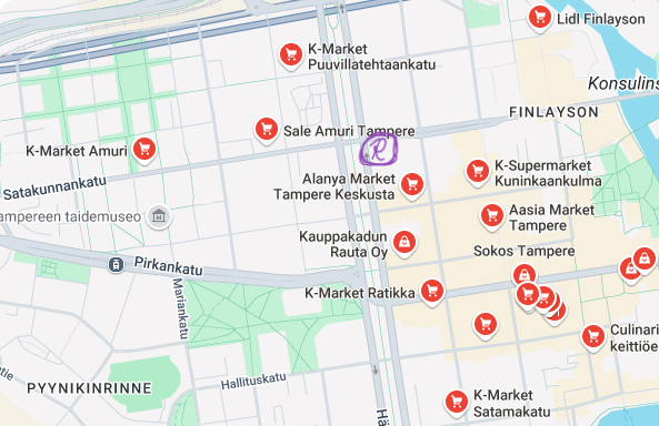 Vaikka Tampereen sykkeessä ollaan, niin hyvä on vähän katsoa lähtösuuntaa, ettei ihan Nokialle horjahtele. Kuvassa R-kirjain salin paikkaa osoittamaan. Pienemmän Häijää-salin päätyikkunoista näkee Sale-Amurin, joten aremmankin tanssijan tulisi säilyä hengissä. Oman ruoan metsästäjille sanottakoon, ettei meillä ole mitään hajua missä gluteenittomat tortilla pitää näillä alueilla pesää. Kyllä niitä muitakin kauppoja, kahviloita yms. putiikkeja kaikkeen makuun löytyy.