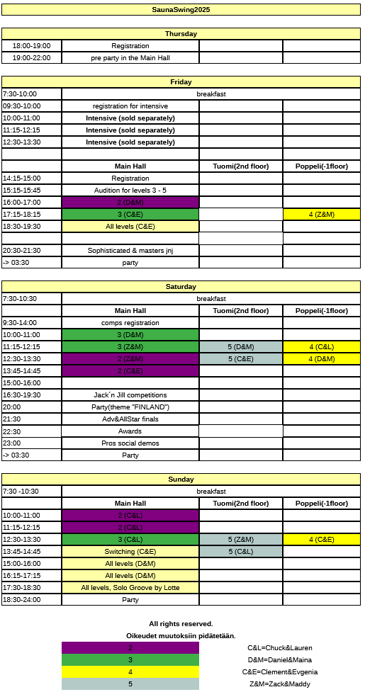 Wristband colours may vary during the weekend compared to other dancers. Colour code in those is ment for event organising staff to recognise certain things from the group. Make sure you get one and keep it all the time in your wrist during the weekend.