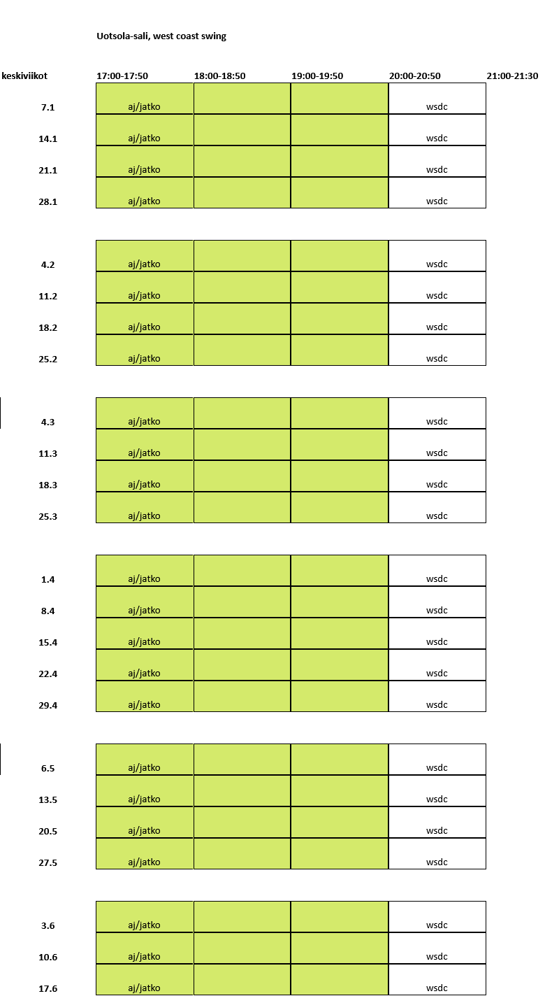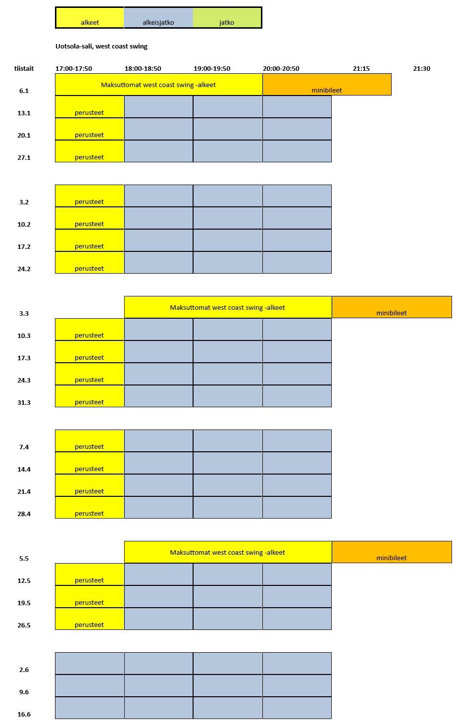 Uudet harrastajat huomio: Et tarvitse tunneille omaa paria. Ennakkoilmoittautumista ei ole, joten paritasapainokin voi olla mitä vain. Käytössä on parinvaihto, joka takaa sen, että kaikki pääsevät vuorollaan tanssimaan. Oman parin kanssa saa halutessaan tanssia.